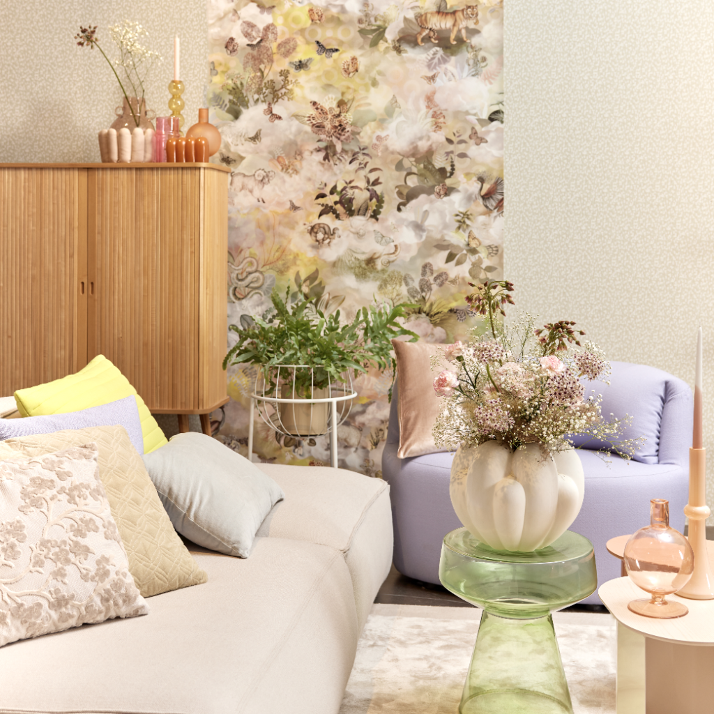 De gebruikte kleuren zijn zacht en stralen rust en harmonie uit. Naast een aantal zachte neutralen en pasteltinten is er ook een warme cognackleur en twee iets meer uitgesproken groentinten.