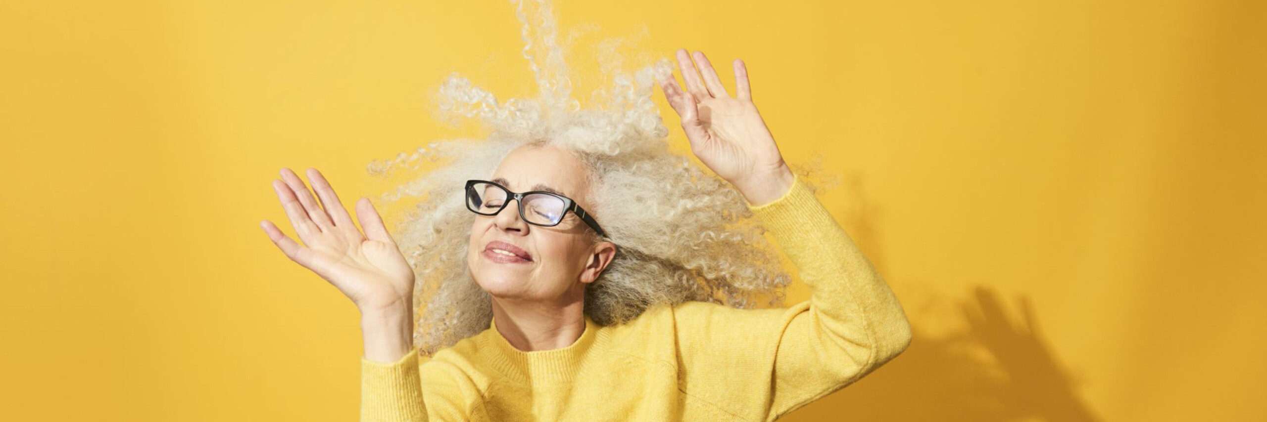 Oudere vrouw danst vrolijk op muziek, symbool voor de actieve levensstijl mogelijk gemaakt door de seniorenregeling.