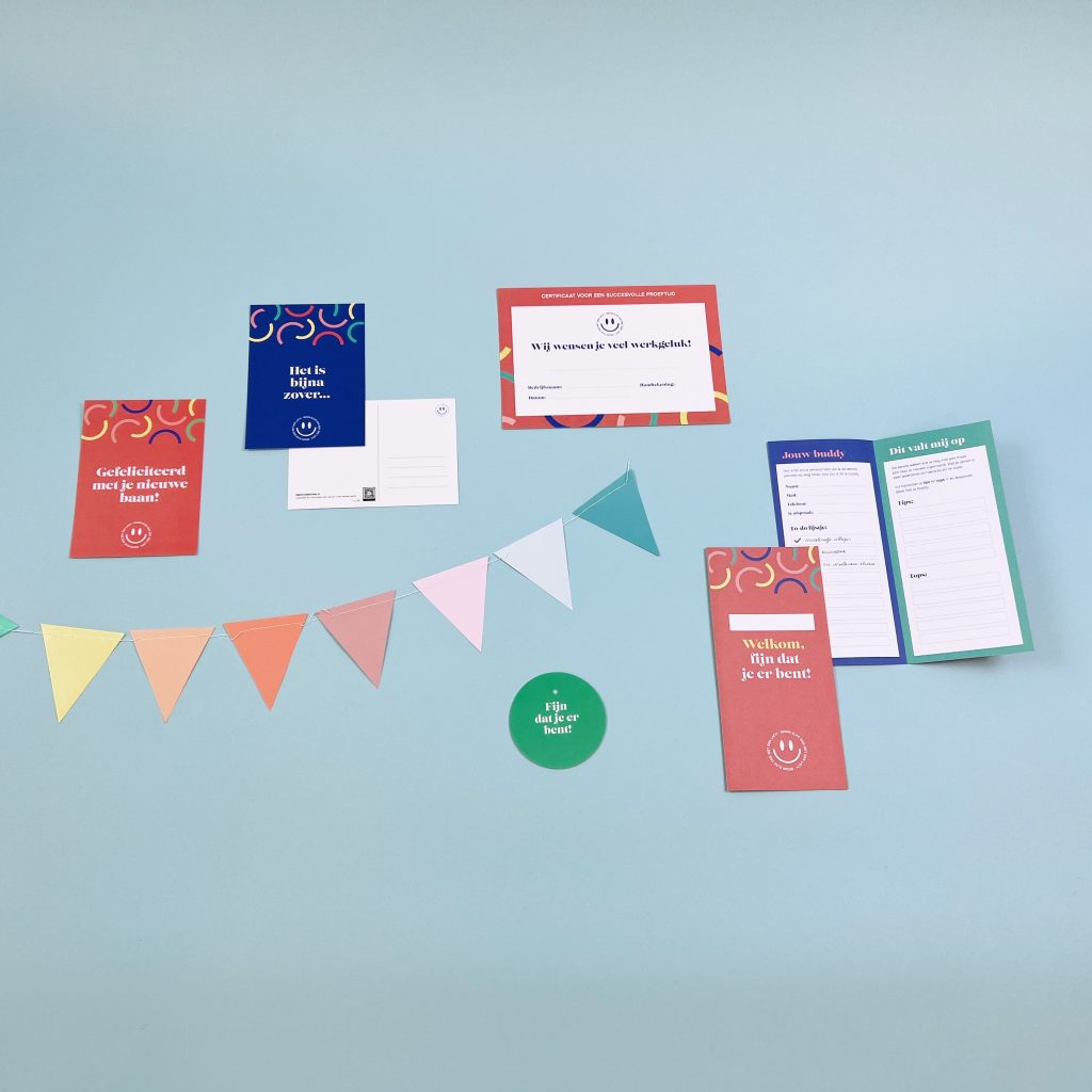 Tijdens het ondertekenen: een gefeliciteerd- met je-nieuwe-baan-kaart met vlaggenlijntje.