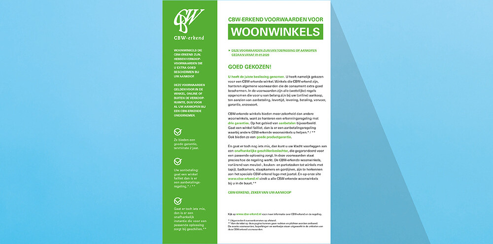 “De CBW-erkend voorwaarden voor Woonwinkels maken deel uit van de koopovereenkomst. Opdrachtgever verklaart door akkoord te gaan met de offerte de tekst van deze voorwaarden te hebben ontvangen”