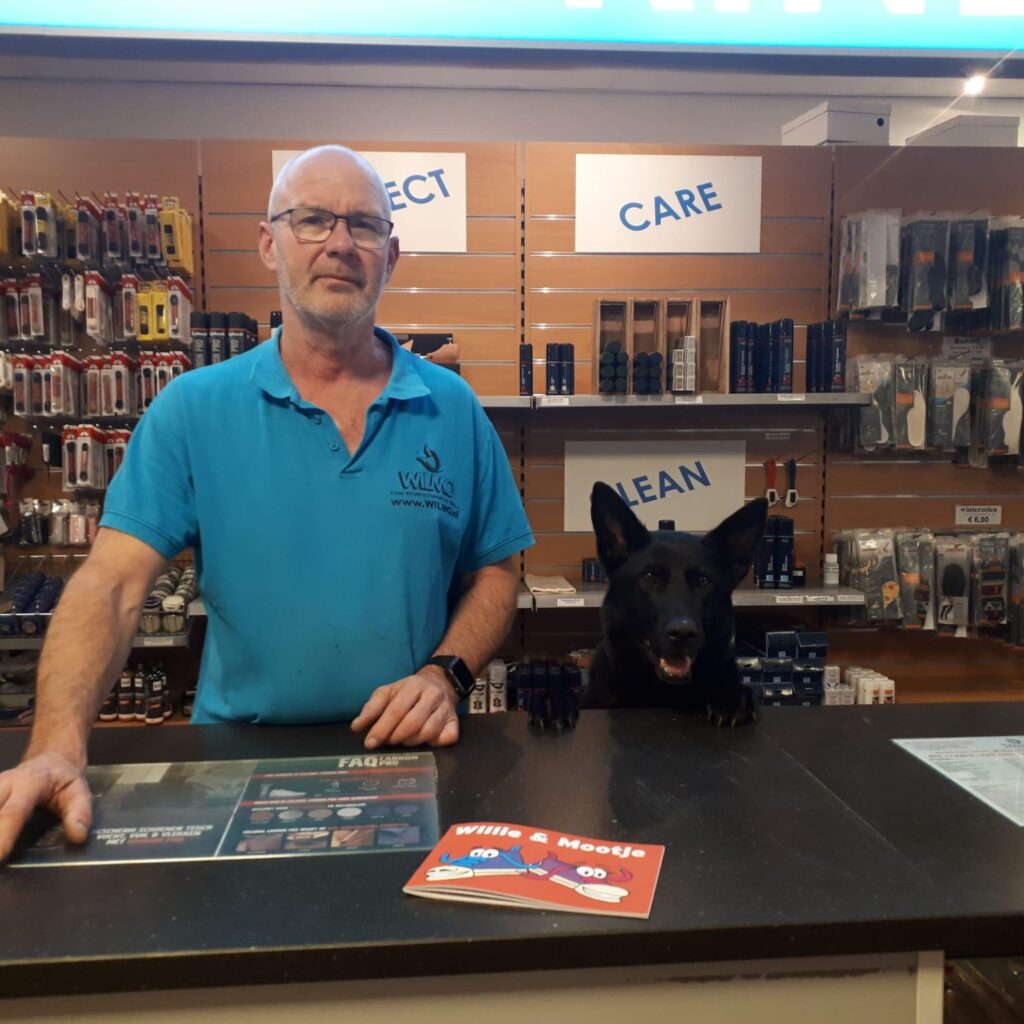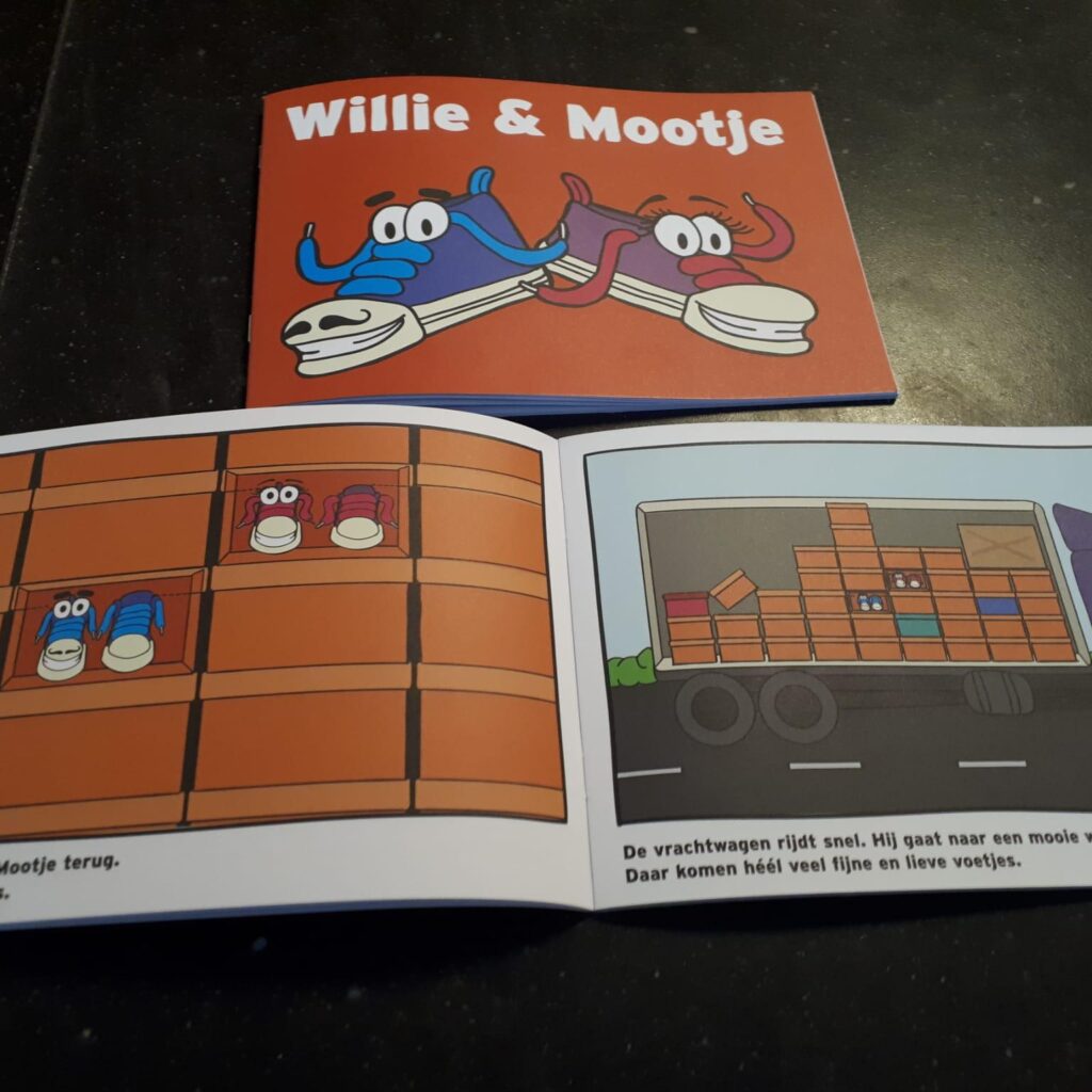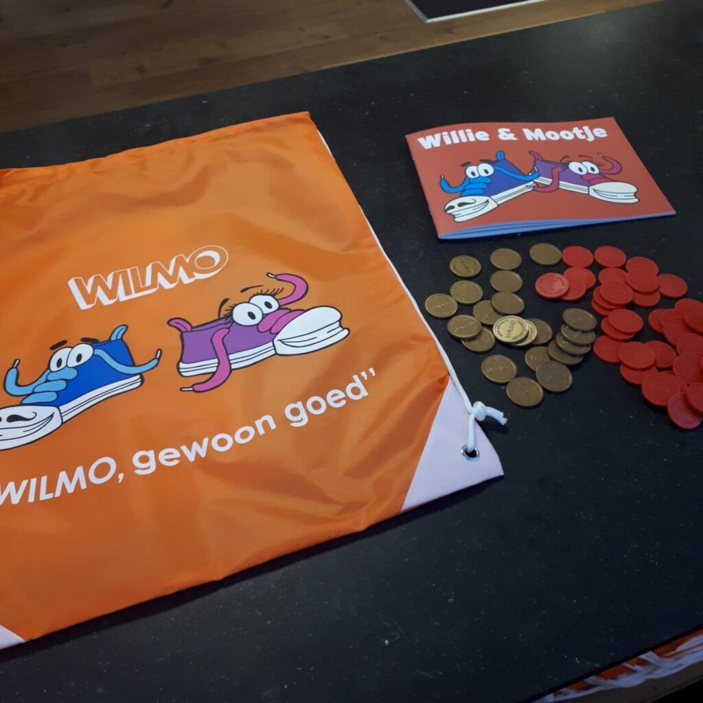 Wij hebben een aantal marketingmiddelen die wij inzetten voor zichtbaarheid. Zo hebben we Wilmo, onze twee honden, de kinderen zijn daar gek op! Ze heten allebei Wilmo. We zorgen dat één van de twee honden altijd aanwezig is: Wilmo is de mascotte van onze winkel en de kinderen groeien samen met hem op. We hebben ook een stripboekje genaamd Willie & Mootje, gebaseerd op de naam van onze honden. Hier leren de kinderen onder andere over de herkomst van schoenen, hoe schoenen worden opgemeten en welke apparatuur we daarvoor gebruiken. Verder hebben we een muntjessysteem. Met die muntjes kunnen de kinderen sparen voor cadeautjes. Daardoor komen zij heel graag terug: sparen voor iets leuks! Wanneer de ouders wat bij ons kopen, krijgen ze een tasje met daarop Willie en Mootje. Deze tassen nemen de kinderen ook mee naar school, dus daar zijn we ook weer zichtbaar.