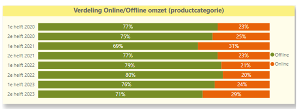 We zien een stijgende lijn in het online omzetaandeel. Na de coronaperiode waarin het online omzetaandeel steeg naar 31%, daalde deze in 2022 weer naar ca. 21%. In 2023 stijgt het online aandeel fors naar 29% in de tweede helft van 2023. Op basis van afzet zelfs naar 34%.