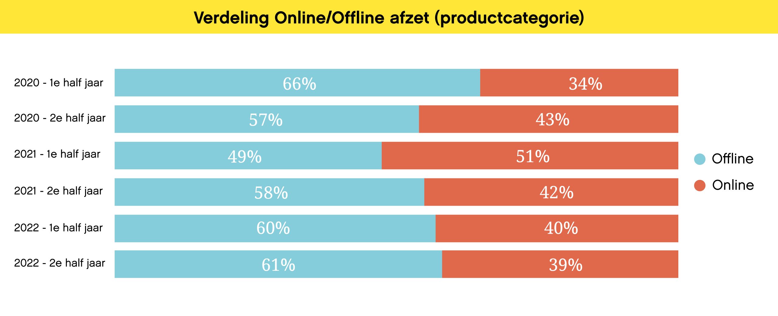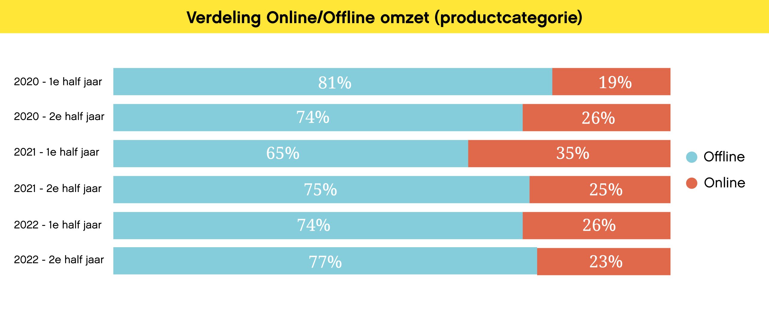 Offline is nog steeds de belangrijkste aankoopplek voor slaapproducten (o.a. boxsprings, complete bedden, losse (top)matrassen losse bedbodems). In de 2e helft van 2022 is 77% van de omzet in slapen offline gerealiseerd. Dat ligt op een iets hoger niveau in vergelijking met de eerste helft van 2022 waar het offline aandeel 74% was. Alleen in de lockdownperiode (1e helft 2021) is het online aandeel tijdelijk gestegen naar ca. 35%.