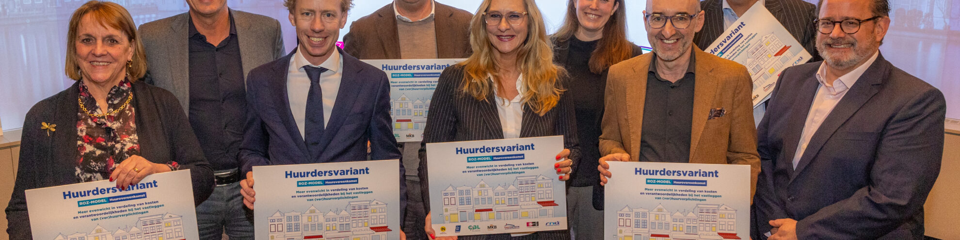 Afbeelding: Tweede Kamerleden Arend Kistenman van VVD, Rachel van Meetelen van PVV en Henk Vermeer van BBB (midden, voorste rij) namen de Huurdersvariant van het ROZ Huurmodel in ontvangst die in Perscentrum Nieuwspoort werd bekend gemaakt.