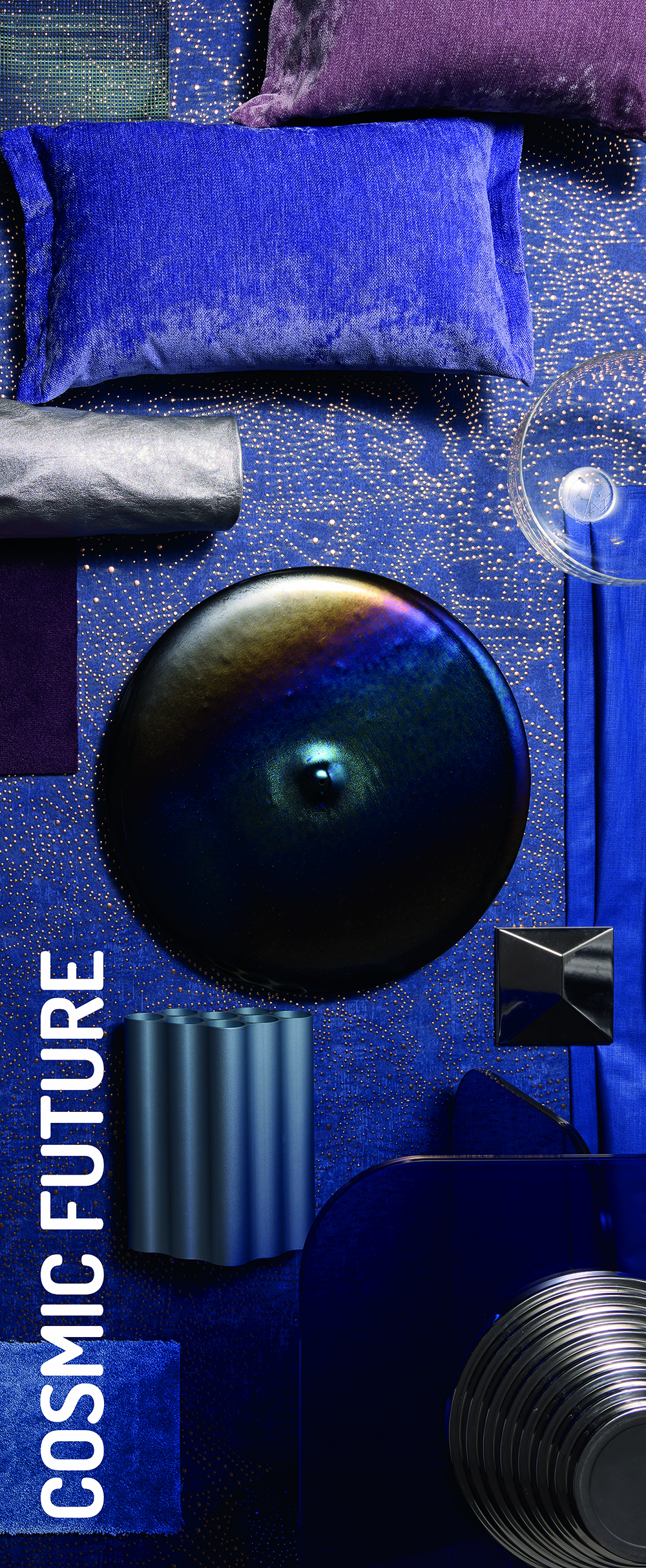 In een maatschappij waar kansenongelijkheid een groeiend probleem is en waar polarisatie nog altijd groots is zoeken we naar een nieuwe manier om brede welvaart bereikbaar te maken voor iedereen. Contact maken met anderen en ook met jezelf staat centraal. Onder invloed hiervan groeit de aandacht voor holistische denkwijzen. In deze trend geeft een koel kleurpallet met blauw- en paarstinten hier uitdrukking aan. Het Cosmic Future moodboard visualiseert deze trend.