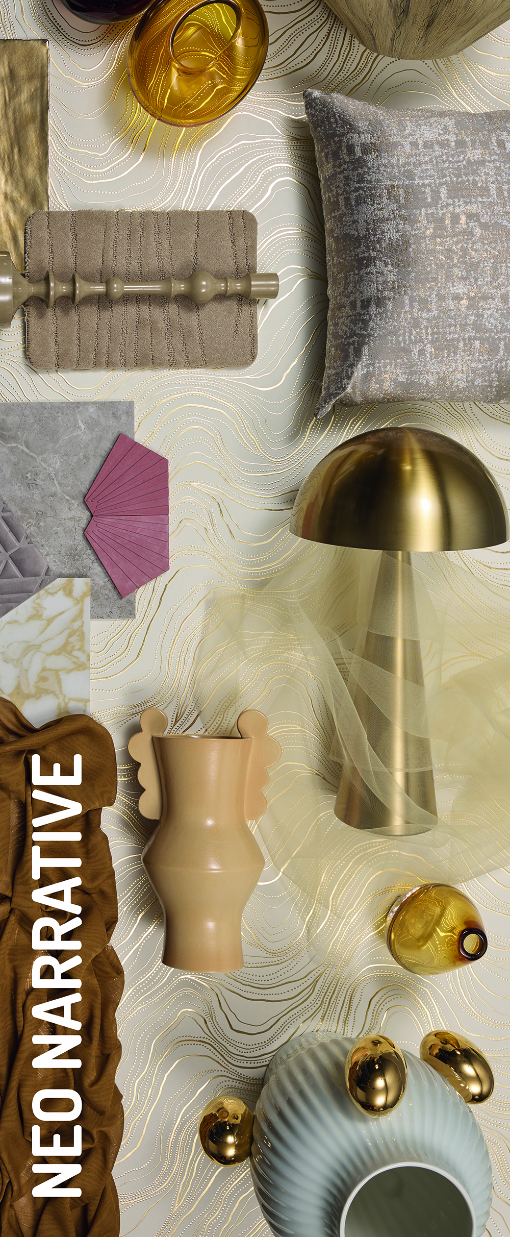 De verschillende crises vliegen ons naar de keel. Deze beklemmende toestand willen we ontvluchten en vermijden. Onder invloed van deze tendens ontstaat een stijltrend waarbij decadentie en luxe belangrijke sleutelwoorden zijn. Rijke materialen met warme kleuren die aan eten of kostbaarheden doen denken, zoals room, karamel, chocola, amber, amethist en bloedkoraal zetten de toon. Het Neo Narrative moodboard visualiseert deze trend.
