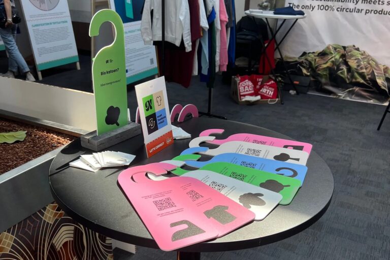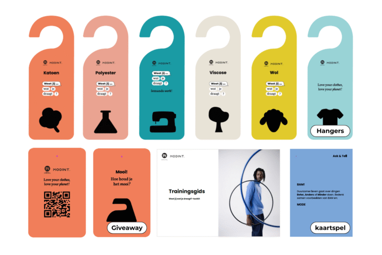 De Weet jij wat je draagt?-toolkit bevat fysieke tools en trainingsmateriaal om makkelijk met klanten in gesprek te gaan over duurzaamheid. De toolkit bevat hangers met opvallende teksten en QR-codes. Die prikkelen én nodigen uit tot een gesprek. In de trainingsgids lees je hoe je dat gesprek slim aanpakt. Je klant krijgt ook een kleine giveaway bij de kassa, die uitnodigt om de QR-code te scannen. Zo ontdekt jouw klant hoe hij zijn kleding langer mooi houdt.
